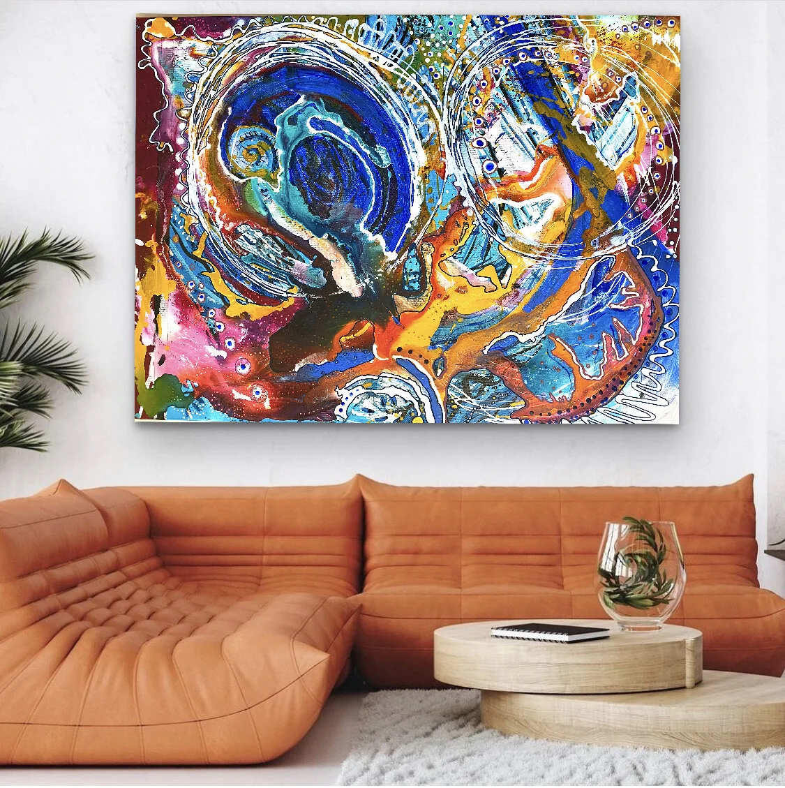 Mangos on the beach takes on the energy of summer for me. It reminds me of plumeria flowers (leis) and the salty breeze in my hair. I can almost taste the juicy mangos. This painting is meant to bring joy to the viewer but all of my abstract art is meant to reflect back to you and awaken images from your creative subconscious mind. What do you see?