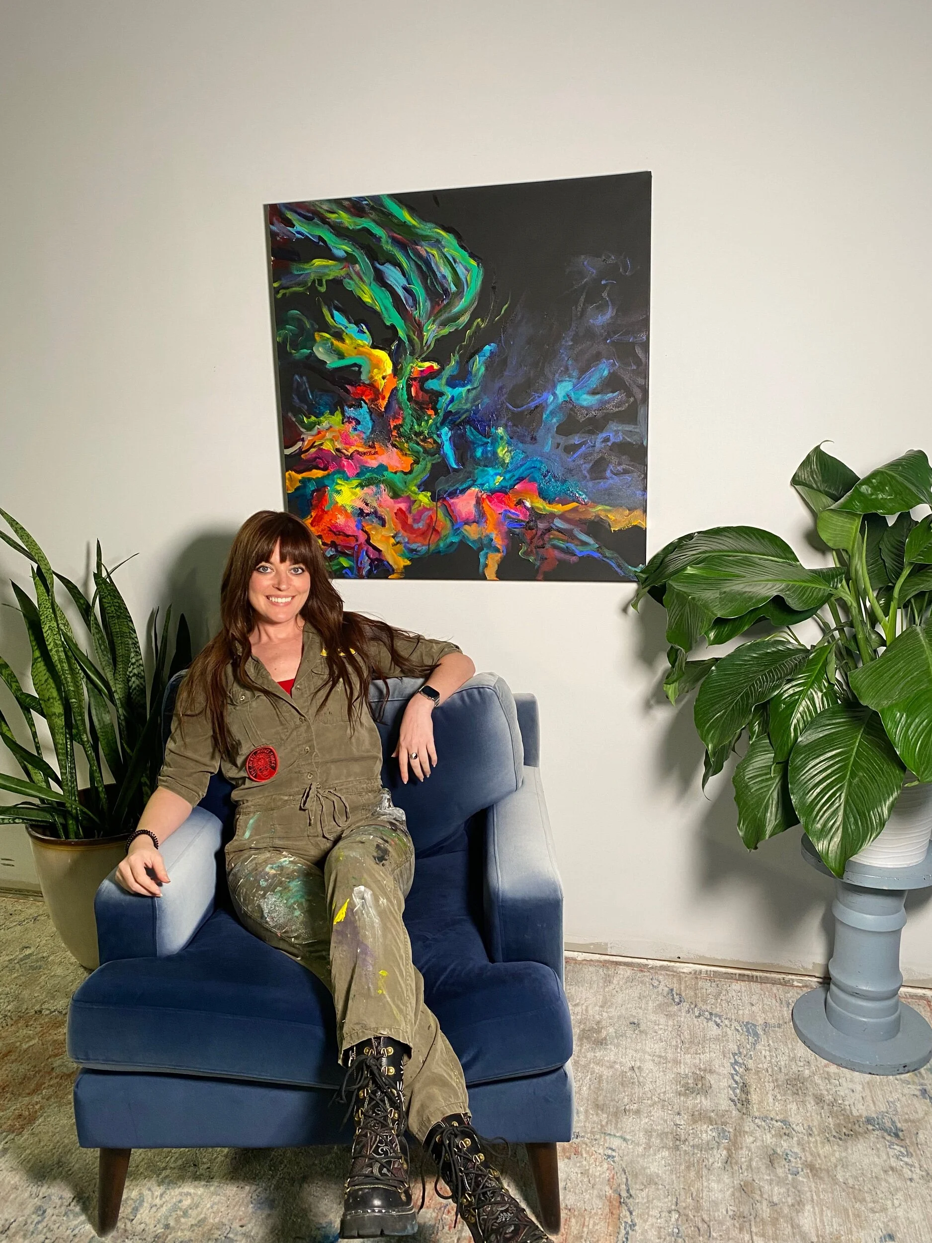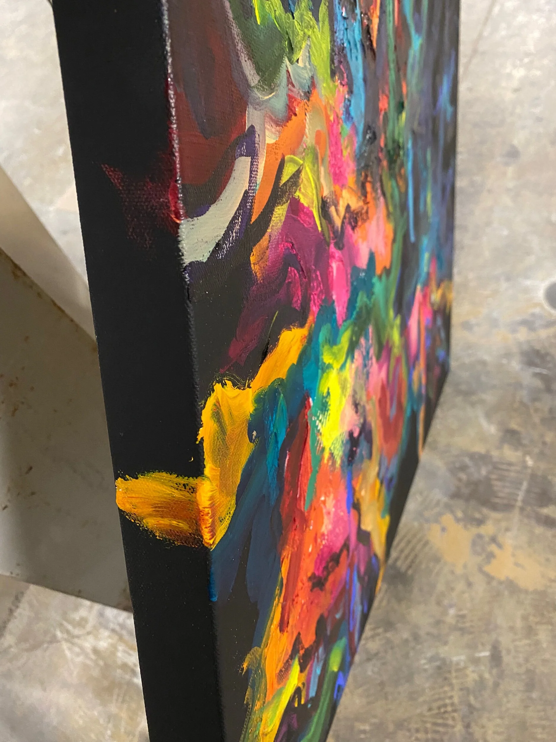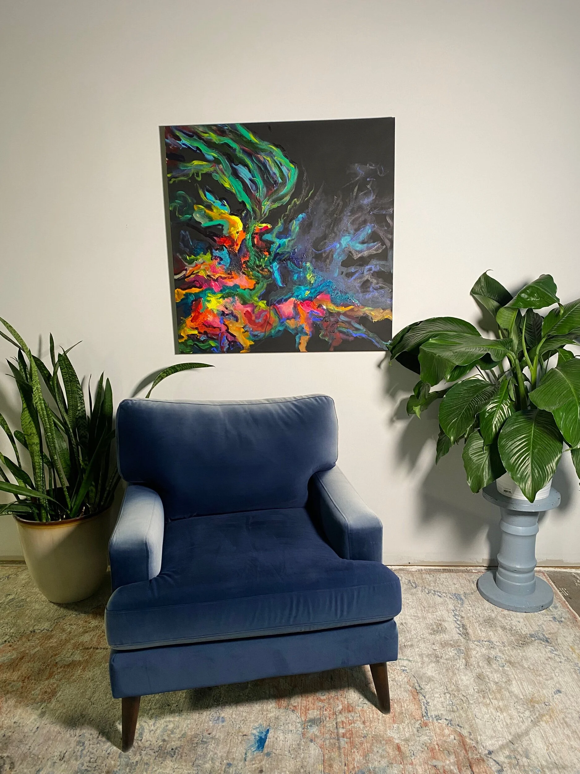 This 36x36 inch acrylic on canvas has so much texture and contrast. The vibrant colors dance around the painting bringing your eyes to all edges of the work.