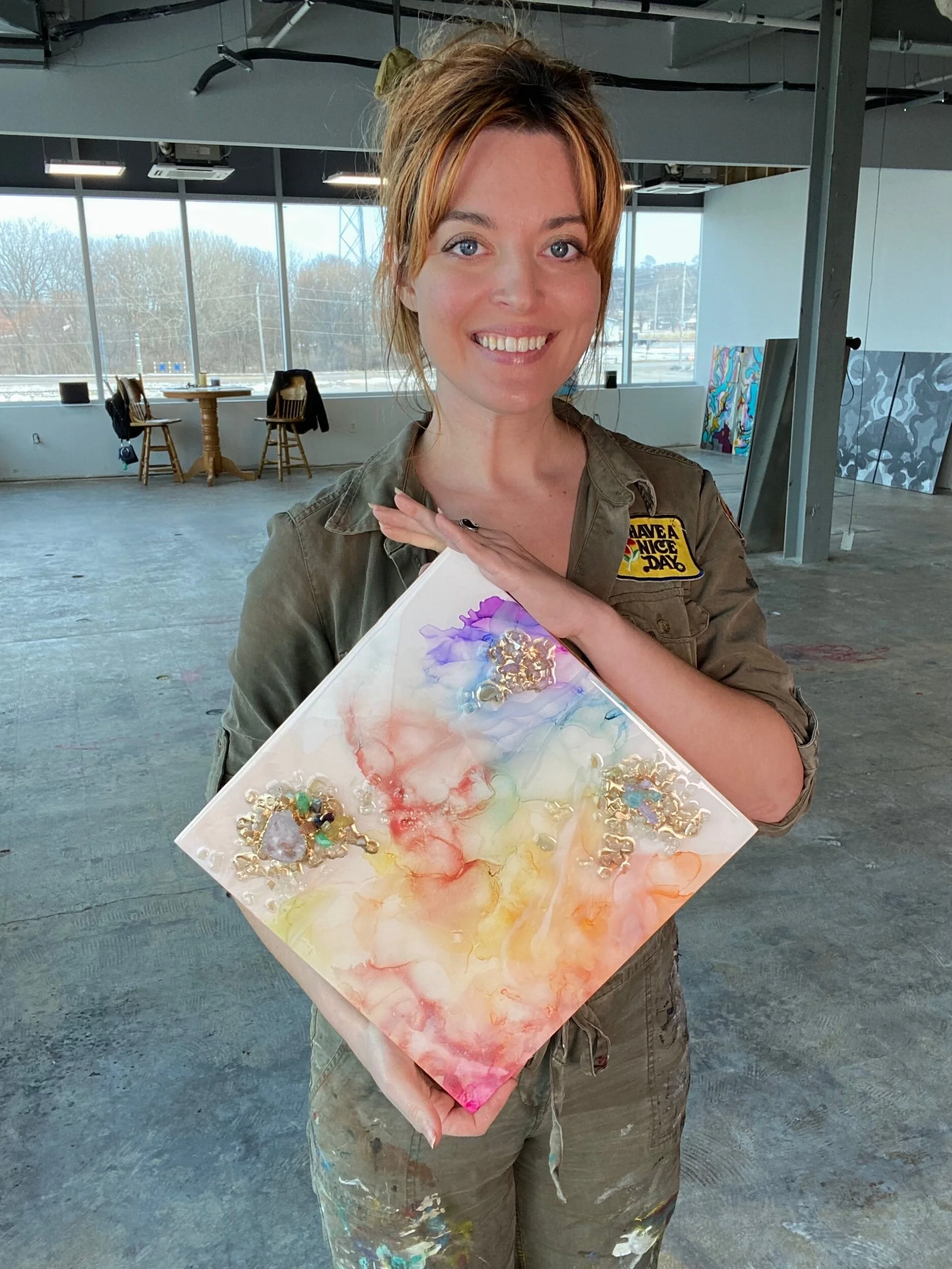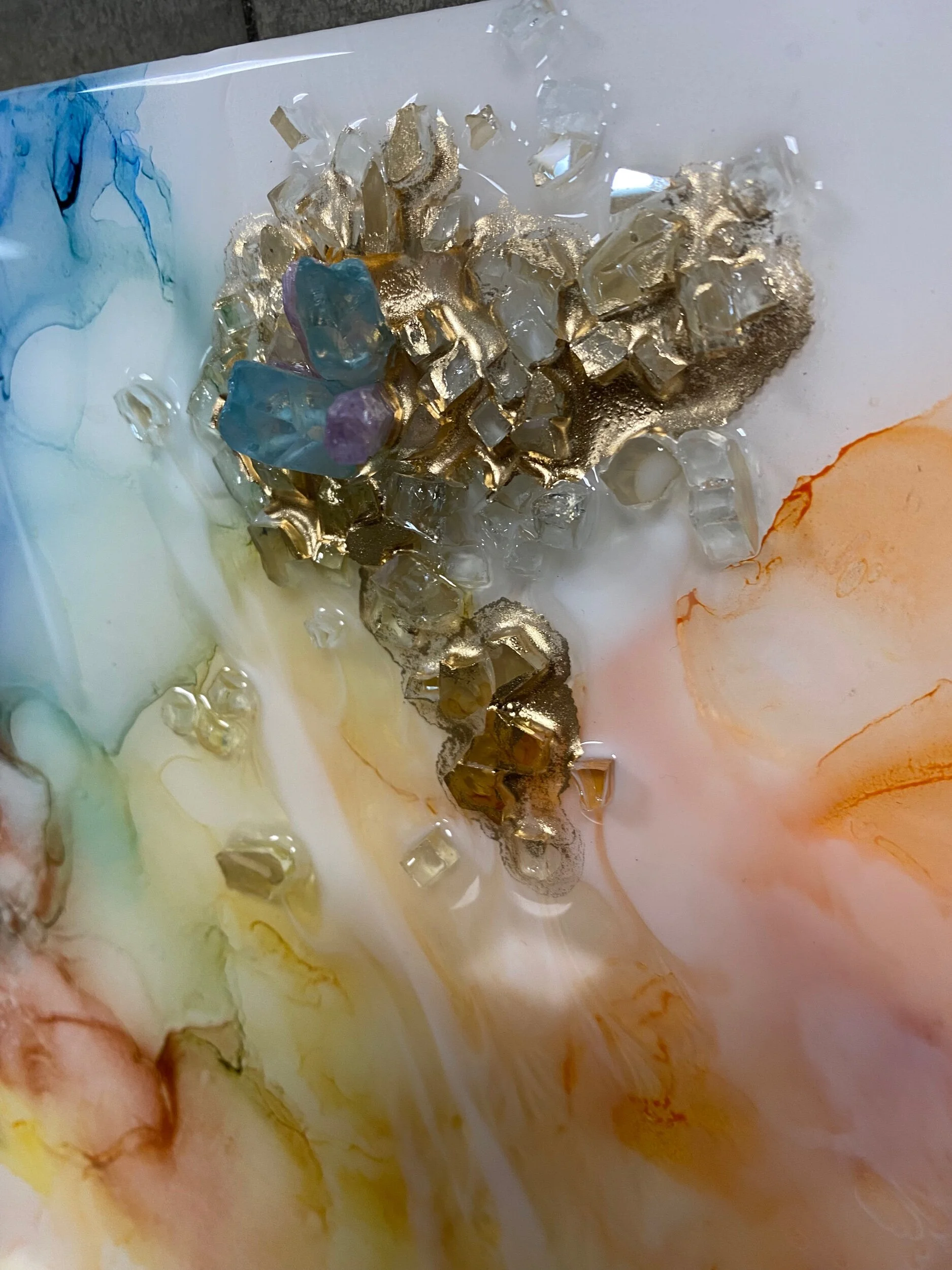 Media includes inks/stone/gems/resin/wood/glass/metal leaf.