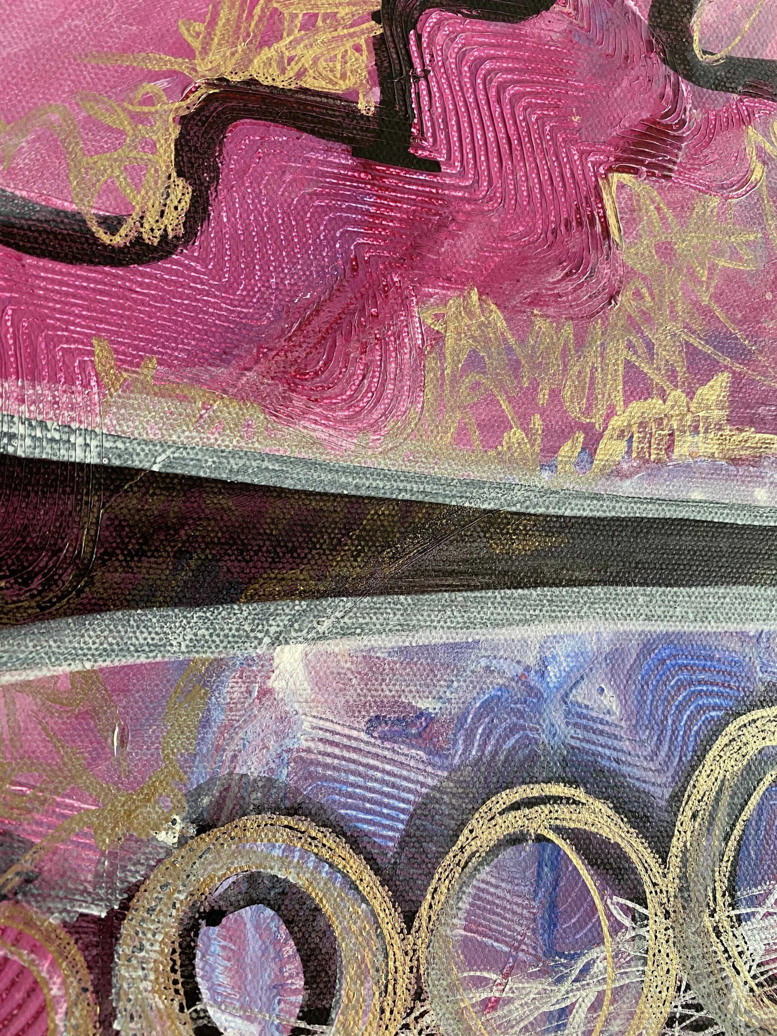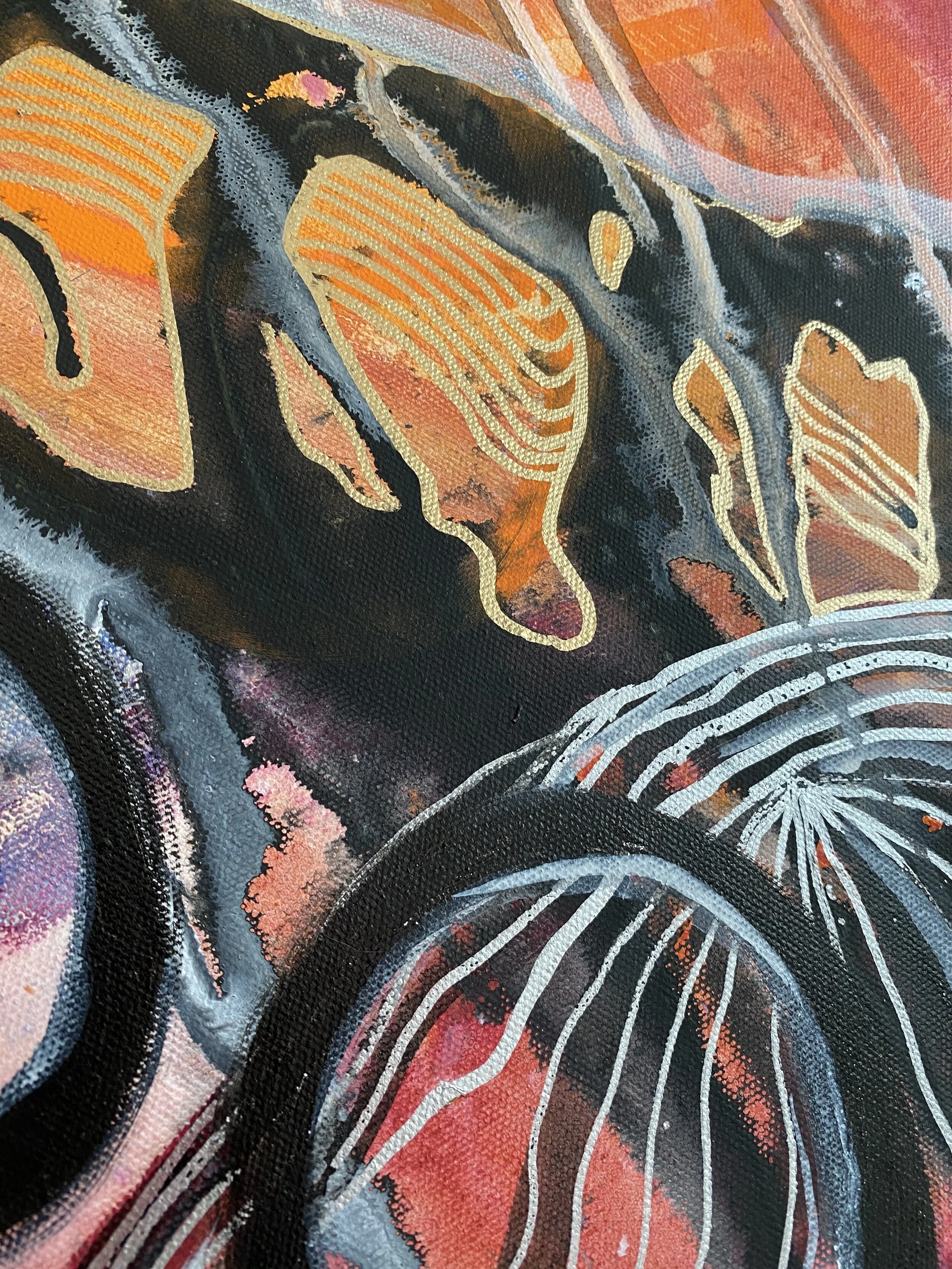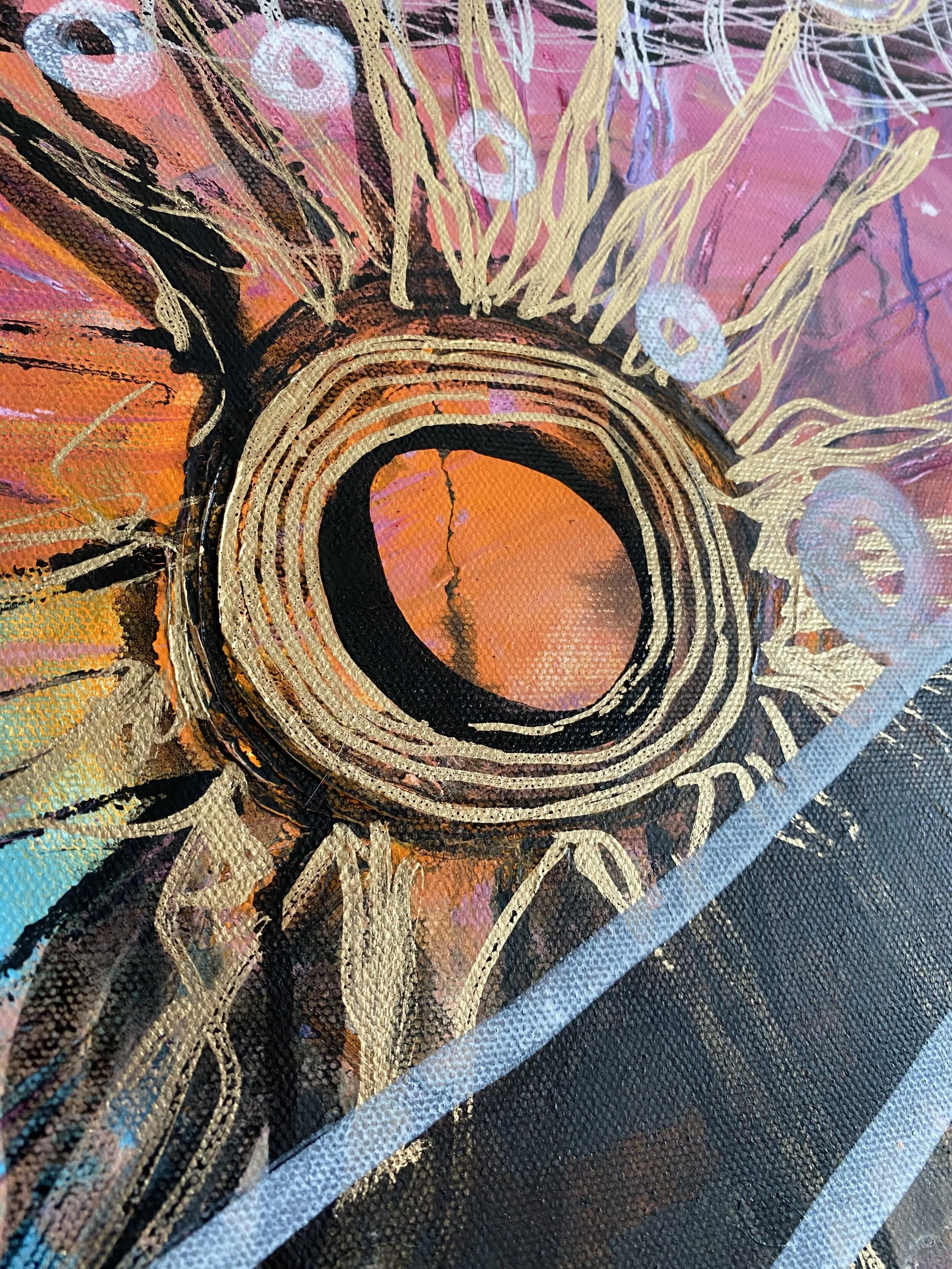 This painting has a phallic ethereal shape floating towards a yonic portal. With two sun resembling shapes and many moons.